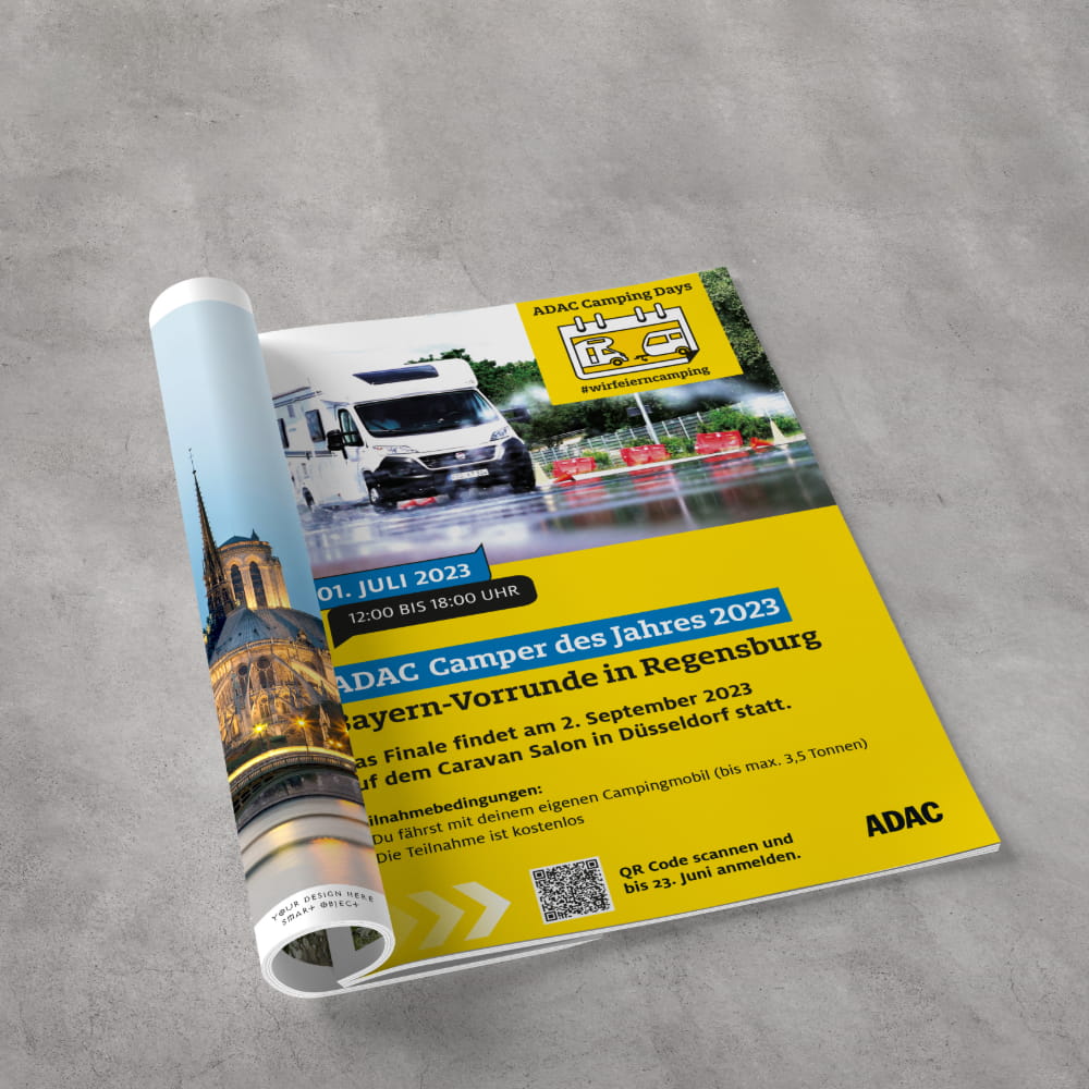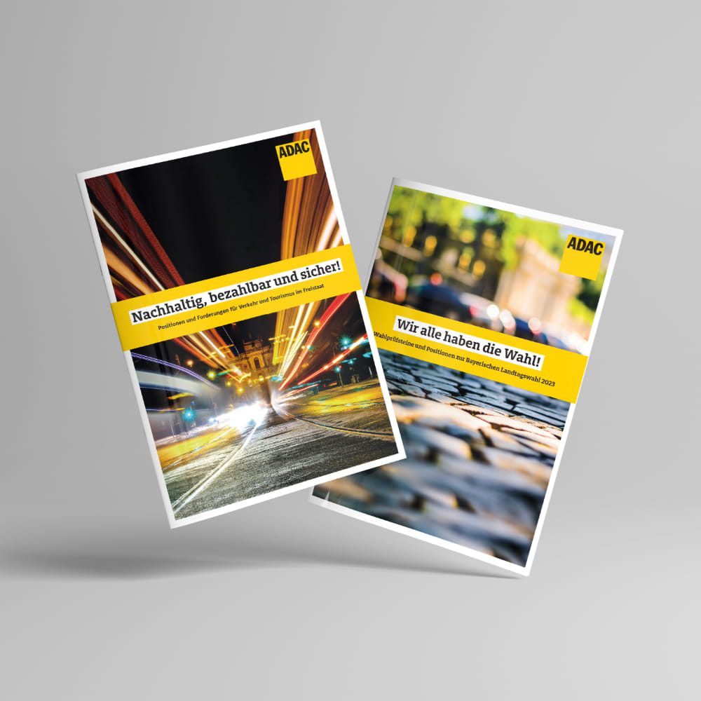 Über verschiedene Fachbereiche hinweg begleiteten wir die visuelle Ausarbeitung spezifischer Themen und Formate. Das Spektrum reichte von Eventformaten wie den „Camping Days“ und der „eMobility-Rallye“ bis zur Vermarktung von Fahrsicherheitstrainings. Für jedes Format entwickelten wir individuelle Layouts und Werbemittel – stets unter konsequenter Einhaltung des Corporate Designs für ein einheitliches Markenbild. Ergänzend unterstützten wir den ADAC Südbayern in der politischen Kommunikation bei der gestalterischen Aufbereitung von Wahlprüfsteinen und Positionspapieren. Komplexe Inhalte wurden durch klare visuelle Hierarchien und eine lesefreundliche Struktur verständlich und zugänglich gemacht.