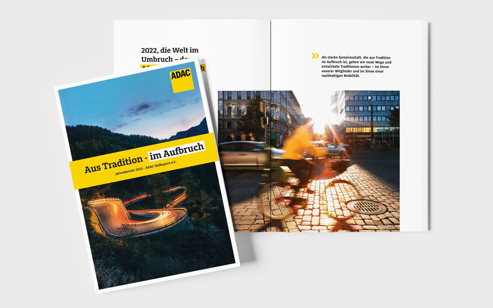 Ein besonderer Schwerpunkt der Zusammenarbeit mit dem ADAC Südbayern war die Gestaltung des Jahresberichts, den wir bereits in zweiter Ausgabe konzipieren und realisieren durften. Von der gestalterischen Leitidee bis zum finalen Layout entwickelten wir ein Erscheinungsbild, das Seriosität, Wertigkeit und Modernität vereint. Neben der Bildauswahl, -bearbeitung und Illustration verantworteten wir auch das Lektorat der Inhalte sowie die Planung der Produktion – inklusive Druckabwicklung und Papierauswahl. Das Ergebnis ist ein Bericht, der komplexe Informationen strukturiert, verständlich und visuell prägnant vermittelt.