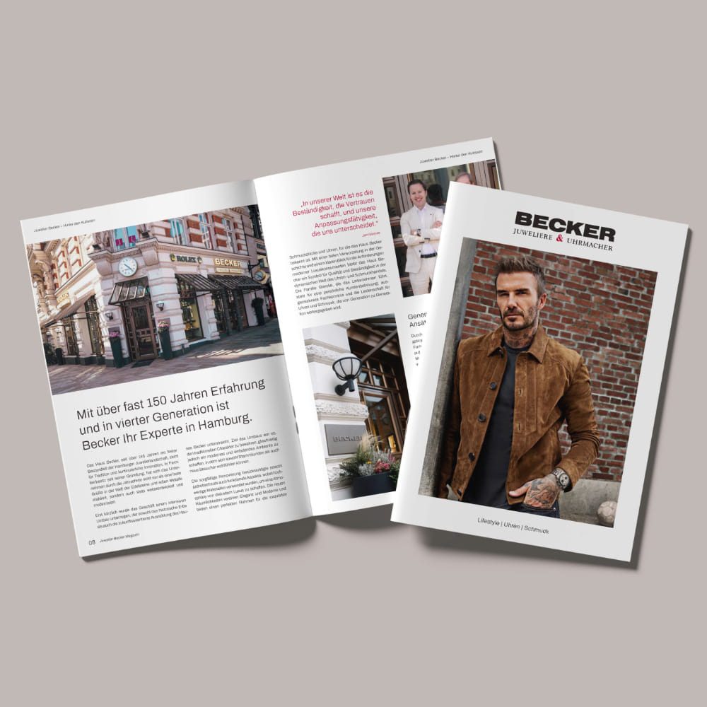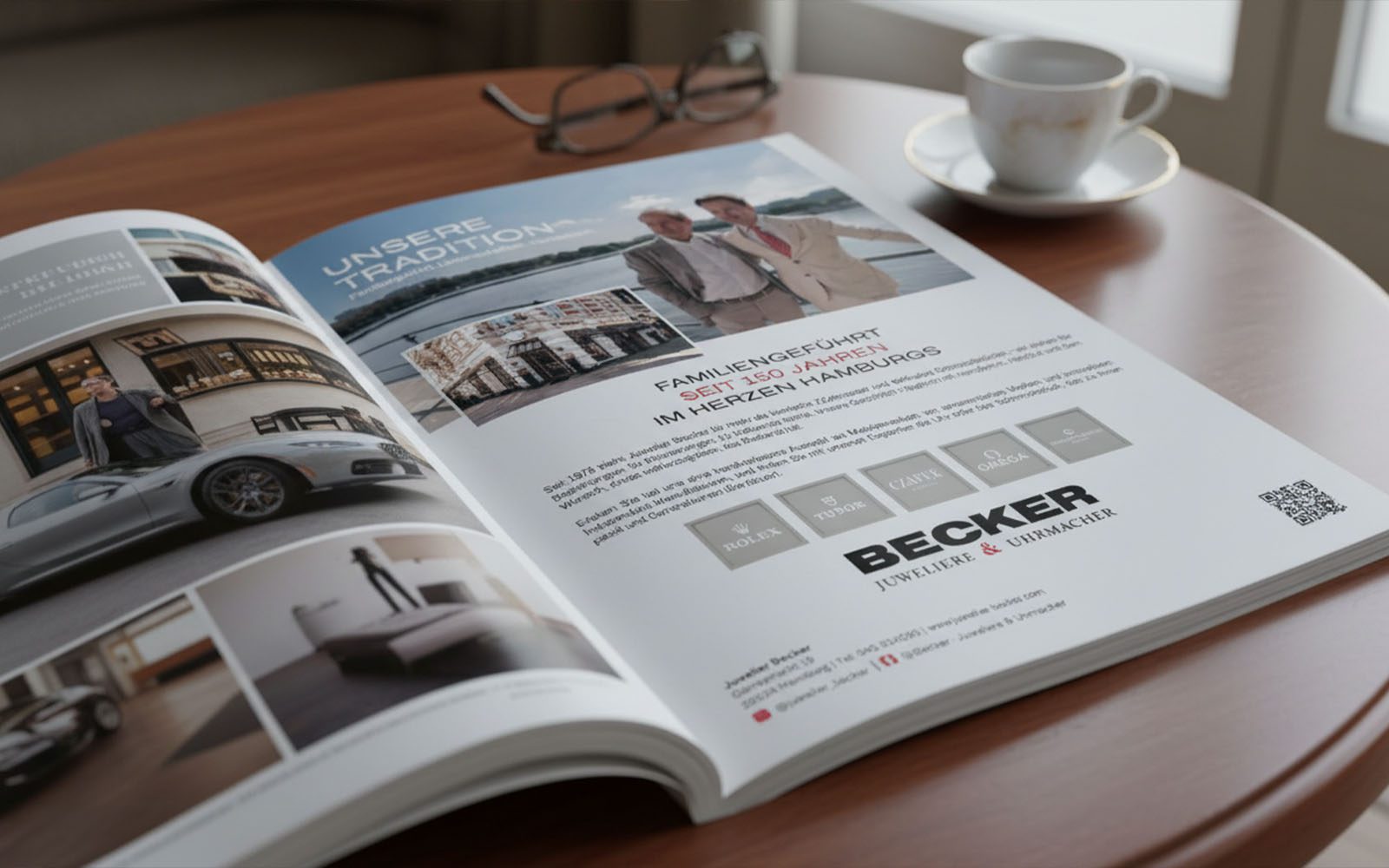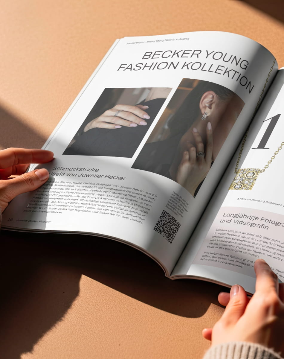 Für Juwelier Becker realisierten wir das exklusive Kundenmagazin „Juweliers Magazin“ als ganzheitliches Kommunikationsprojekt. Ziel war es, ein hochwertiges, konsistentes Medium zu schaffen, das die Marke und ihre Partner auf elegante Weise präsentiert und gleichzeitig für Kunden informativ und inspirierend ist.